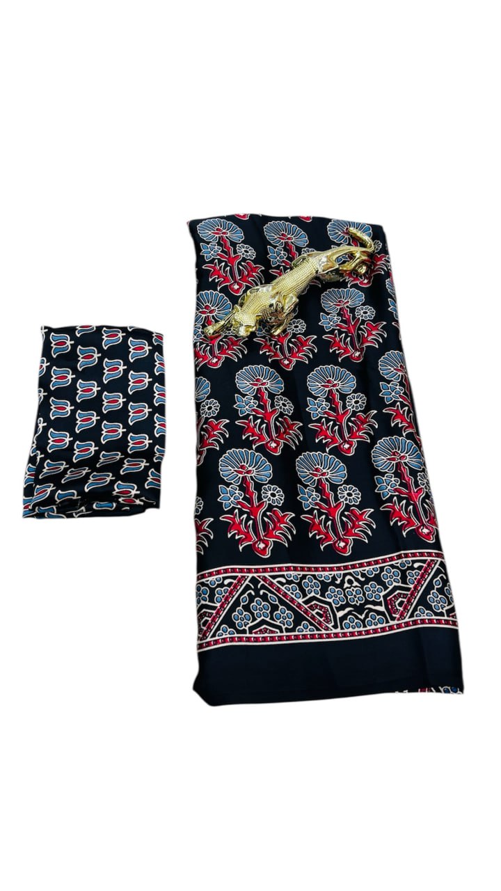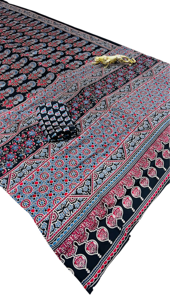 Black Ajrakh Rich Pallu With Contrast Blouse Saree