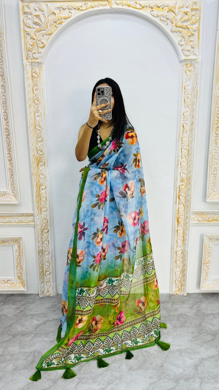 Sky Blue And Perrot Border Premium Lilan Cotton Saree