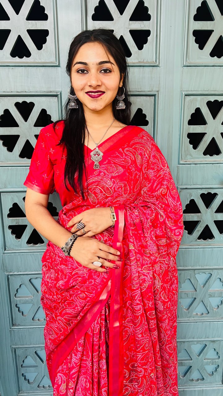 Bright Red Mul Mul Cotton Silk Print Lightweight Saree