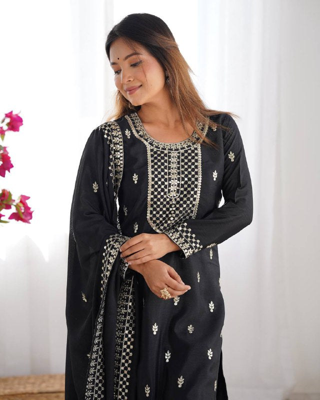 Black Pure Chinon Silk Fabric With Beautiful Embroidery Sequence And Jari Work Plazzo Set