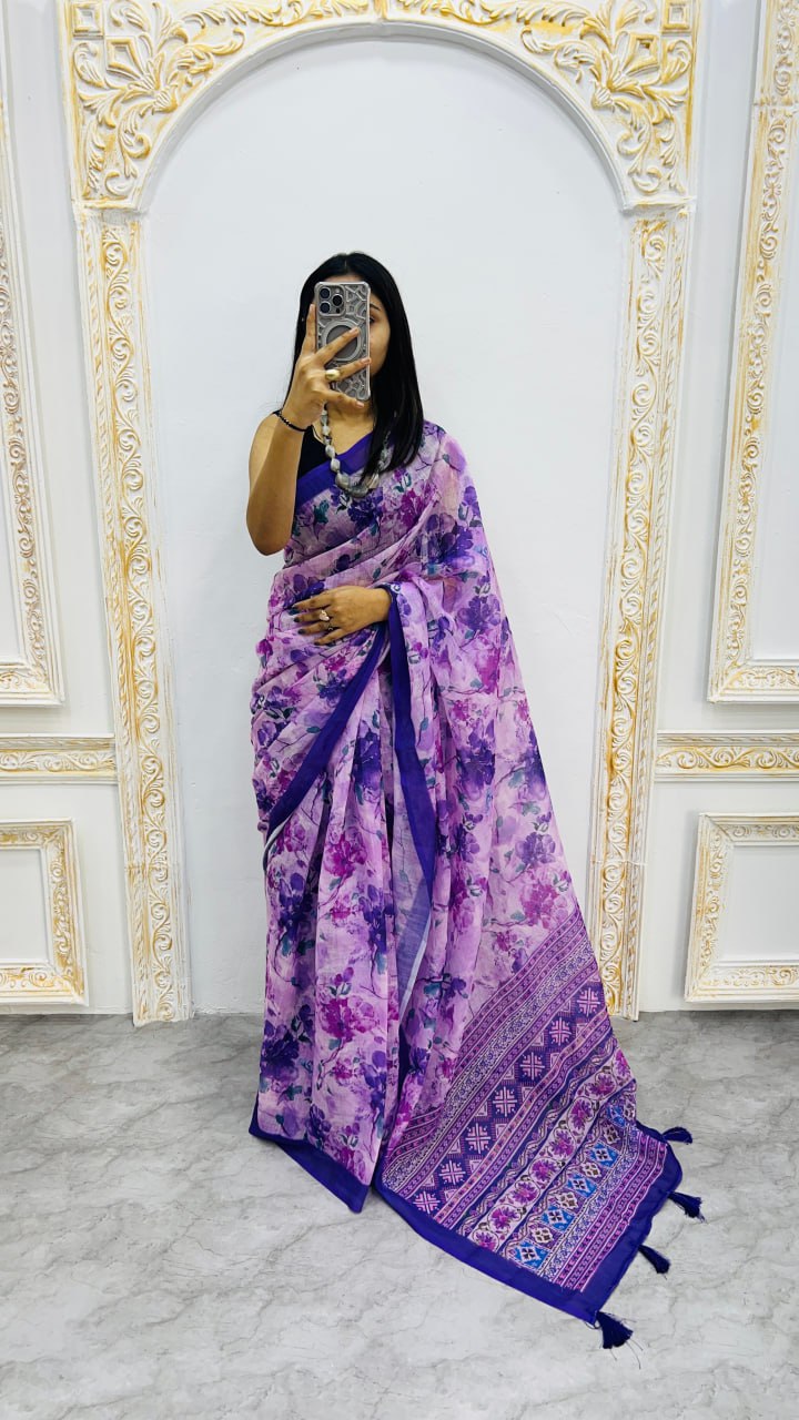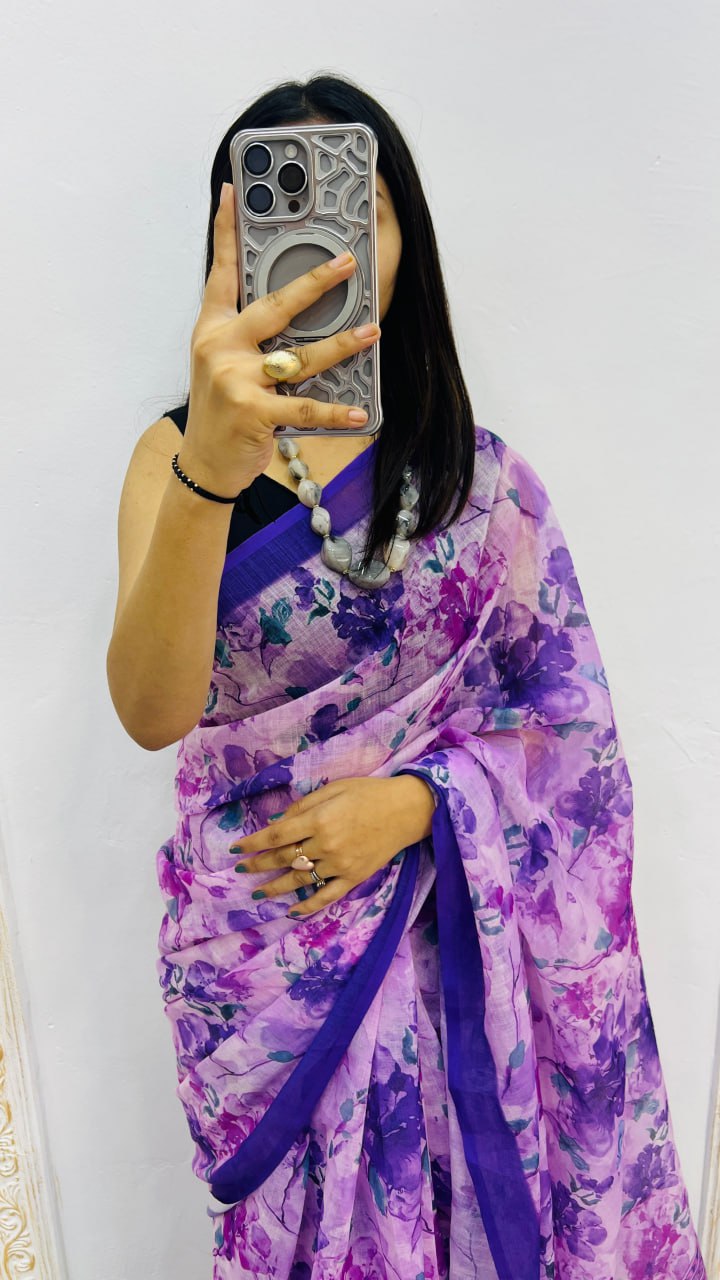 Blue Premium Lilan Cotton Beautiful Floral Lotus Print Saree