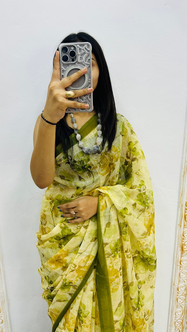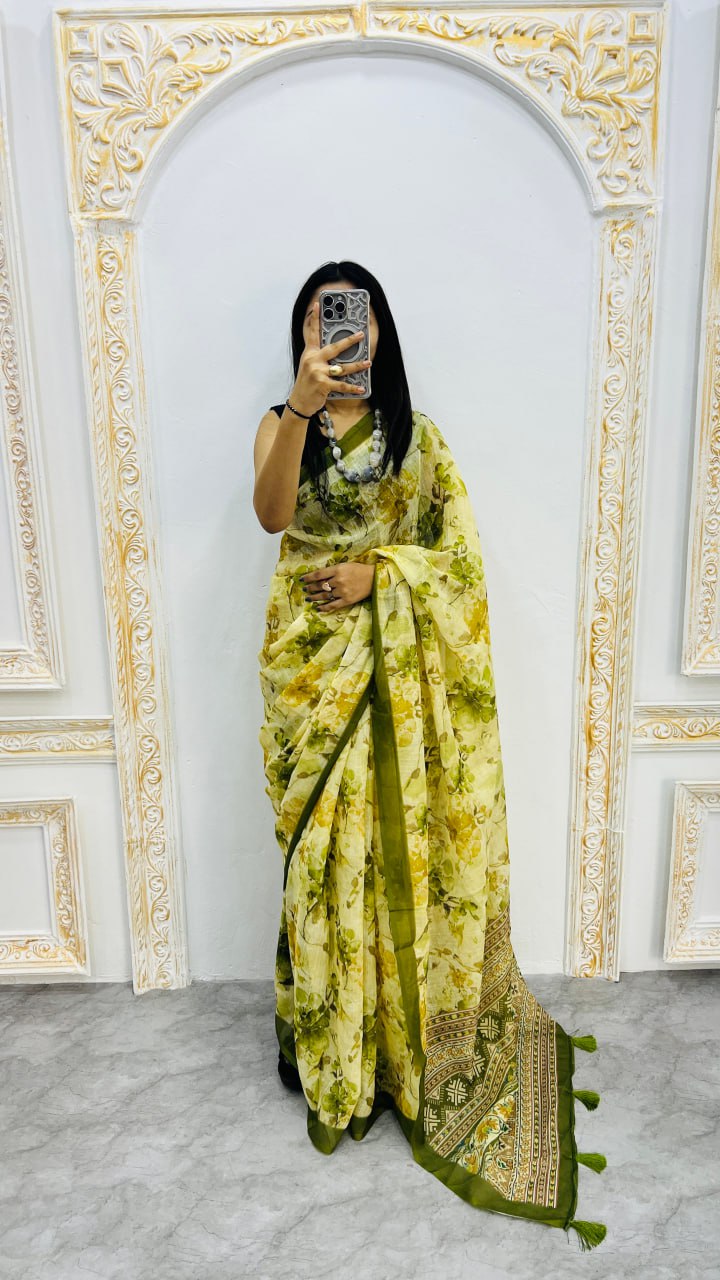 Mehandi Premium Lilan Cotton Beautiful Floral Lotus Print Saree