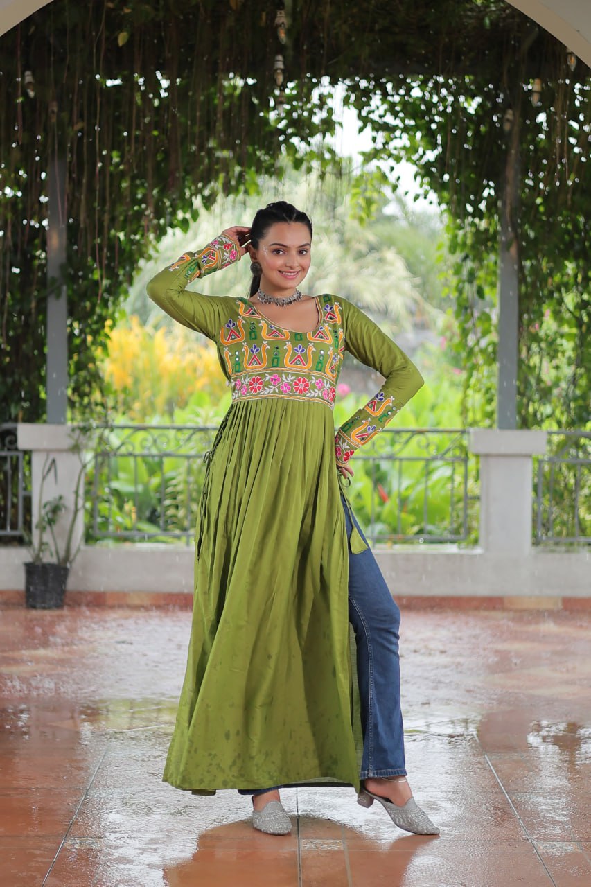 Green Rayon Kutchi Gamthi Work Round Neck Navratri Special Gown